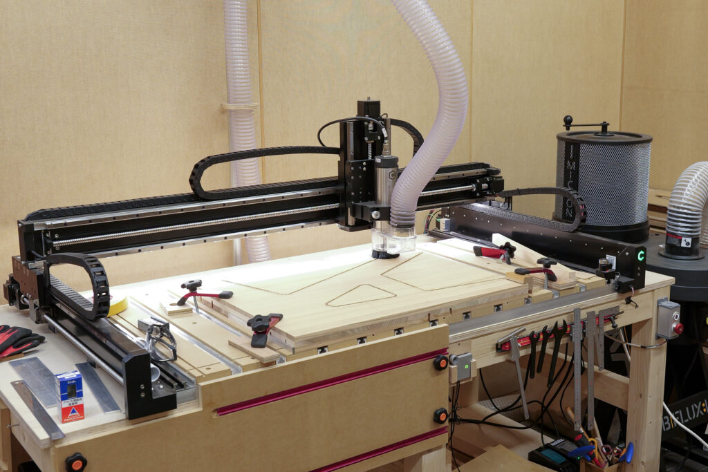 CNC(Computer Numerical Control:コンピューター数値制御)マシンとは、コンピュータで作成したプログラム通りに機械を動かすことができるもので、回転する刃物(ビット)を、X軸・Y軸・Z軸の3方向に精密に動かすことで、木材を切削することができます。